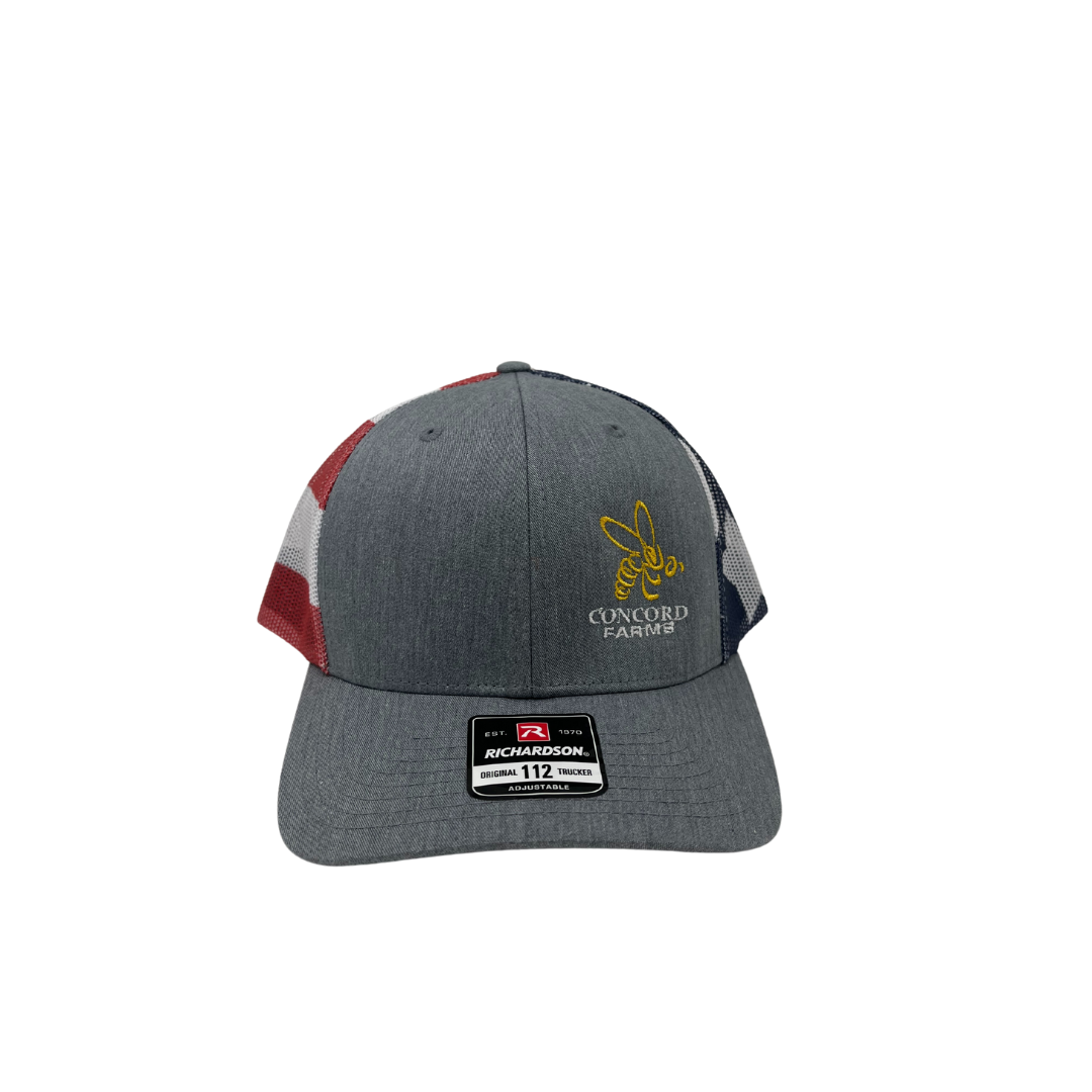 Richardson original 112 trucker hat with a gray front and American flag mesh snap back. Modern Concord Farms' logo on the left front.